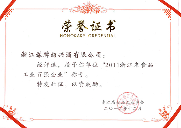 2011年度浙江省食品工業(yè)百強(qiáng)企業(yè)稱號榮譽(yù)證書
